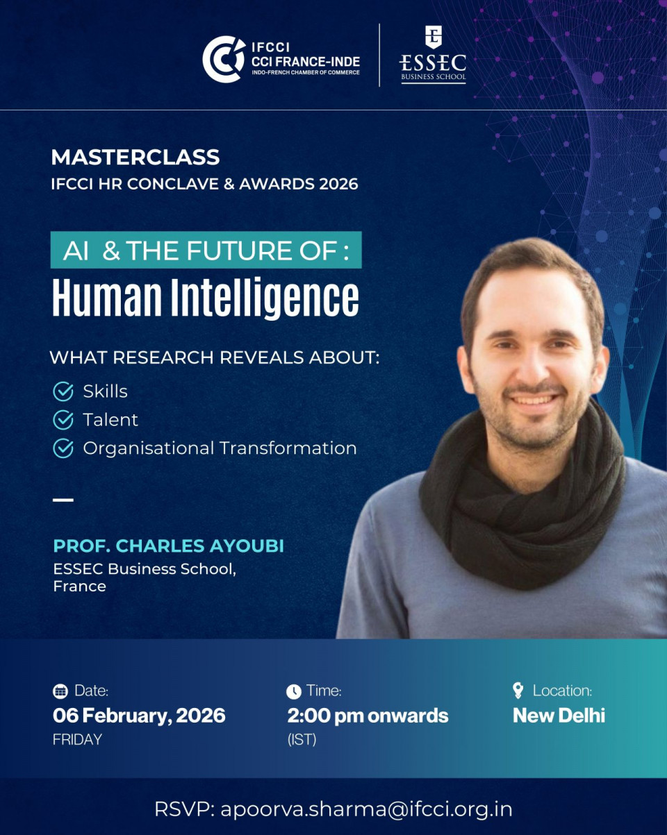 𝐌𝐚𝐬𝐭𝐞𝐫𝐜𝐥𝐚𝐬𝐬 𝐨𝐧 𝐀𝐈 & 𝐭𝐡𝐞 𝐅𝐮𝐭𝐮𝐫𝐞 𝐨𝐟 𝐇𝐮𝐦𝐚𝐧 𝐂𝐚𝐩𝐢𝐭𝐚𝐥 | 𝐈𝐅𝐂𝐂𝐈 𝐇𝐑 𝐂𝐨𝐧𝐜𝐥𝐚𝐯𝐞 & 𝐀𝐰𝐚𝐫𝐝𝐬 𝟐𝟎𝟐𝟔 Indo-French Chamber of Commerce & Industry (IFCCI) and ESSEC Business School are pleased to present an exclusive Masterclass at the sixth edition of 𝗜𝗙𝗖𝗖𝗜 𝗛𝗥 𝗖𝗼𝗻𝗰𝗹𝗮𝘃𝗲 & 𝗔𝘄𝗮𝗿𝗱𝘀 𝗼𝗻 𝟬𝟲𝘁𝗵 𝗙𝗲𝗯𝗿𝘂𝗮𝗿𝘆 𝟮𝟬𝟮𝟲, in New Delhi being organised in the august presence of the Ambassador of France to India, H.E. Mr. Thierry Mathou. Led by Prof. Charles Ayoubi, ESSEC Business School, the masterclass will explore the theme of, “𝑨𝑰 & 𝒕𝒉𝒆 𝑭𝒖𝒕𝒖𝒓𝒆 𝒐𝒇 𝑯𝒖𝒎𝒂𝒏 𝑪𝒂𝒑𝒊𝒕𝒂𝒍: 𝑾𝒉𝒂𝒕 𝑹𝒆𝒔𝒆𝒂𝒓𝒄𝒉 𝑹𝒆𝒗𝒆𝒂𝒍𝒔 𝑨𝒃𝒐𝒖𝒕 𝑺𝒌𝒊𝒍𝒍𝒔, 𝑻𝒂𝒍𝒆𝒏𝒕, 𝒂𝒏𝒅 𝑶𝒓𝒈𝒂𝒏𝒊𝒔𝒂𝒕𝒊𝒐𝒏𝒂𝒍 𝑻𝒓𝒂𝒏𝒔𝒇𝒐𝒓𝒎𝒂𝒕𝒊𝒐𝒏.” As hashtag#ArtificialIntelligence rapidly reshapes the world of work, Business & HR leaders are being called upon to navigate emerging technologies that will enable profound shifts in skills, talent models, and organizational design. Designed for senior HR and business leaders, this masterclass bridges rigorous academic research with real organisational challenges to offer clarity, perspective, and actionable takeaways in an era of accelerating AI adoption The IFCCI hashtag#HRConclave and Awards has established itself as a premier platform for knowledge exchange and networking amongst Senior HR professionals with a focus on the Indo-French business domain. Don’t miss this incredible opportunity to attend this exclusive hashtag#Masterclass by one of France’s top hashtag#HigherEducation Institutes. 𝗥𝗦𝗩𝗣 𝗮𝘁 𝗮𝗽𝗼𝗼𝗿𝘃𝗮.𝘀𝗵𝗮𝗿𝗺𝗮@𝗶𝗳𝗰𝗰𝗶.𝗼𝗿𝗴.𝗶𝗻