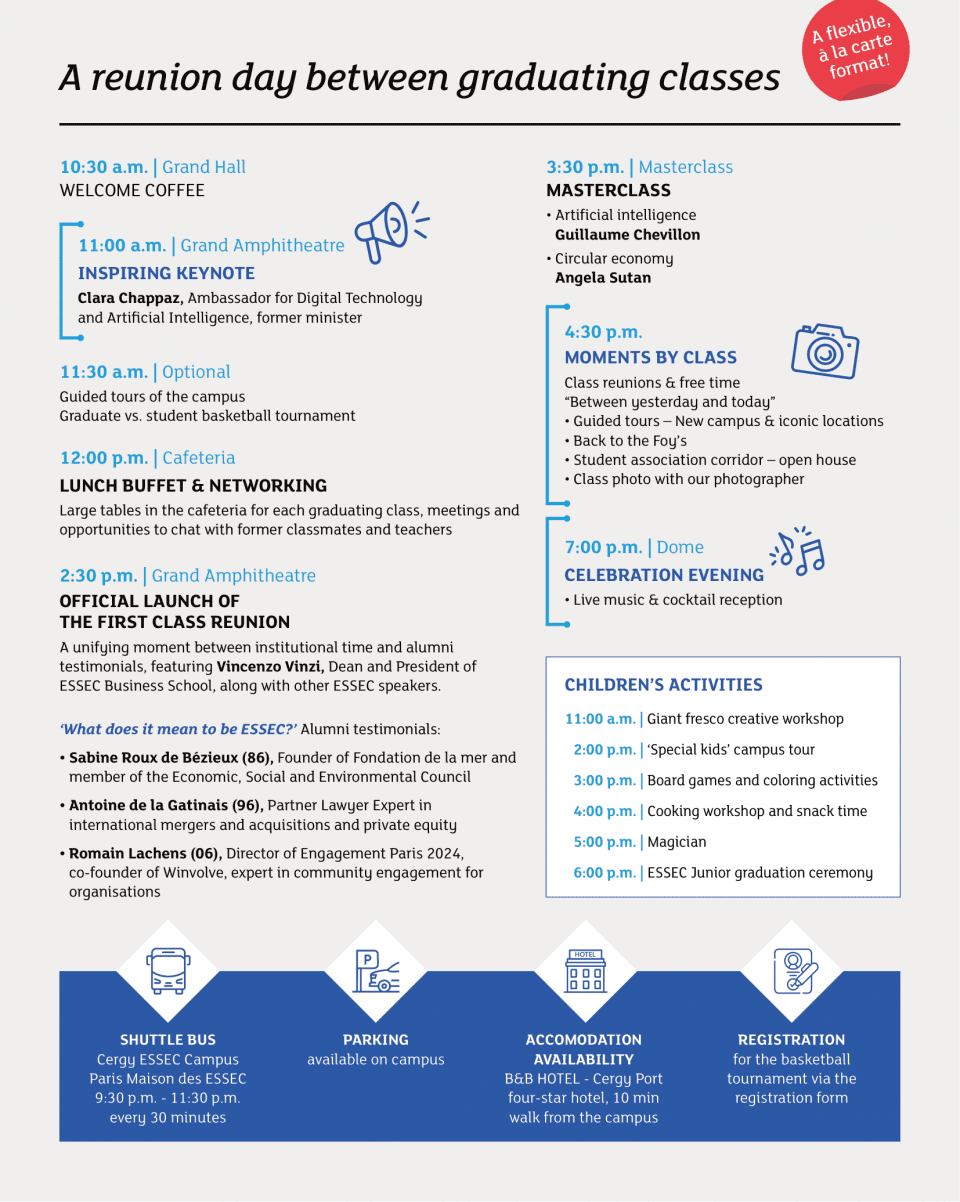 As the number of places on campus is limited, registration is open to ESSEC graduates of the classes concerned, as well as their spouses and children.