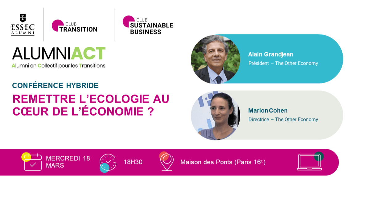 Le Club ESSEC Transition Alumni et le Club ESSEC Alumni Sustainable Business avec le support d'Alumni ACT vous invitent à participer à une conférence suivie d'un cocktail :