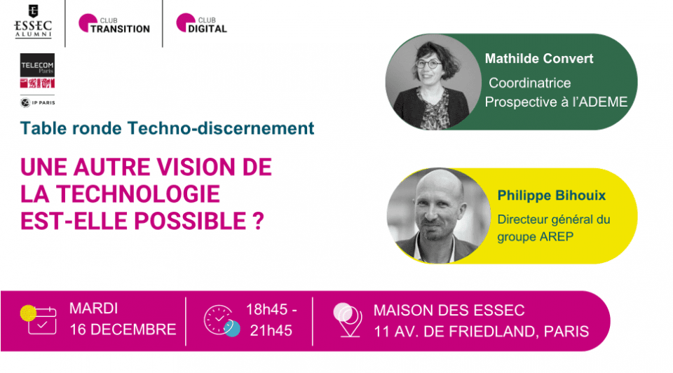Dans le prolongement du ciné-débat du 14 octobre 2025 à la rencontre des acteurs des low tech qui expérimentent au quotidien et le plus souvent à petite échelle (https://www.essecalumni.com/fr/event/cine-debat-low-tech-a-la-rencontre-des-acteurs-de-la-low-tech/2025/07/21/7530), nous explorerons avec nos deux intervenant(e)s les voies d’un techno-discernement déployé plus largement dans nos sociétés :