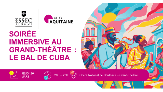 Le Club ESSEC Alumni Aquitaine vous propose de prendre part à une soirée immersive exceptionnelle le 26 mars 2026, en participant ensemble au prochain bal dédié à Cuba, et à l'occasion duquel le Grand Foyer va vibrer au rythme de la musique cubaine : découvrez ainsi ce haut lieu de culture comme vous ne l'aurez jamais vu !