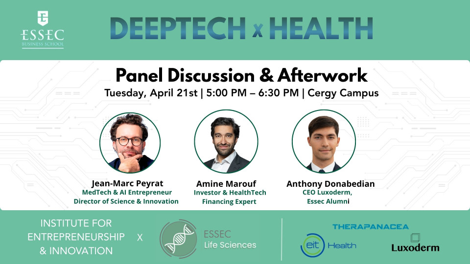 Join us for a roundtable discussion: “DeepTech in Health: demystifying innovation, exploring opportunities” The session will be introduced by the ESSEC Momentum Studio, specialized in DeepTech, setting the stage for key insights and perspectives on the ecosystem. Through a cross-perspectives format, this roundtable will bring together:- A young entrepreneur from the ESSEC Student Incubator (Anthony Donabedian, LUXODERM)