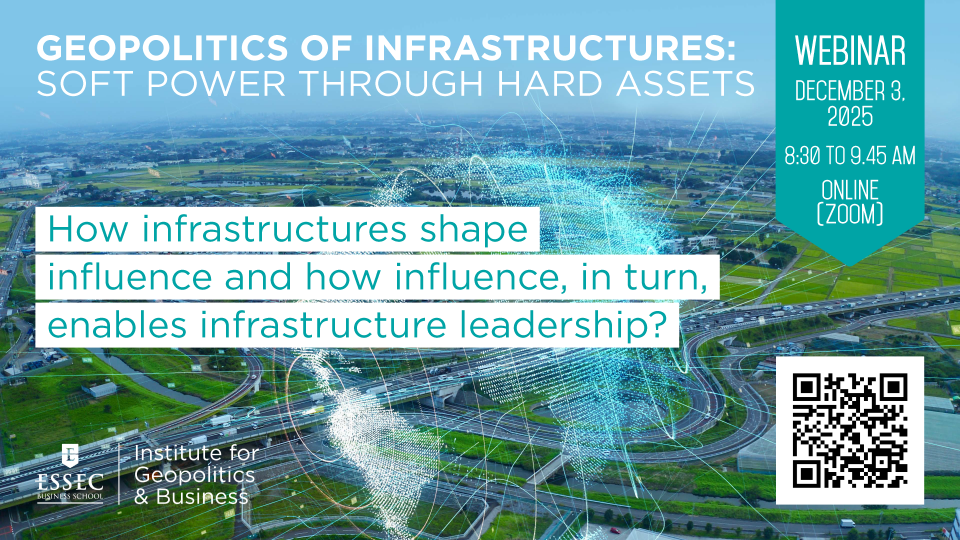 Dear Sir or Madam,The ESSEC Institute for Geopolitics & Business and the IRENE Center for Negotiation & Mediation are pleased to invite you to our upcoming webinar on the theme: “Geopolitics of Infrastructures: Soft Power through Hard Assets”.The session will be held in English on December 3rd, 2025, from 8:30 to 9:45 AM (CEST) on Zoom, and will be moderated by Thomas FRIANG, Executive Director, ESSEC Institute for Geopolitics & Business. Our featured speakers involve:Julien MICHEL - Managing-Director for Energy & Transportation, NatixisDenis SIMONNEAU - Diplomat, French Ministry of Foreign Affairs / Former Director for International Affairs and Executive Committee Member, EngieMounir CORM - Directeur général adjoint et associé-fondateur de Vauban Infrastructure partnersHoly RANAIVOZANANY - Deputy Executive Director, Africa-Europe Foundation (tbc)In today’s fragmented global order, infrastructure has become a geopolitical battleground. From energy corridors to digital backbones and high-speed transport routes, the contest to build, control, and connect is as strategic as it is physical. The European Union’s Global Gateway and China’s Belt and Road Initiative exemplify this new diplomacy of steel and fiber optics. In this webinar, we will explore how infrastructures shape influence—and how influence, in turn, enables infrastructure leadership. Please register to confirm your participation and receive the Zoom link.Ahead of the conference, we invite you to visit the Institute's website and follow our LinkedIn page for regular updates.We look forward to welcoming you online.Warm regards,The Team of ESSEC Institute for Geopolitics & Business