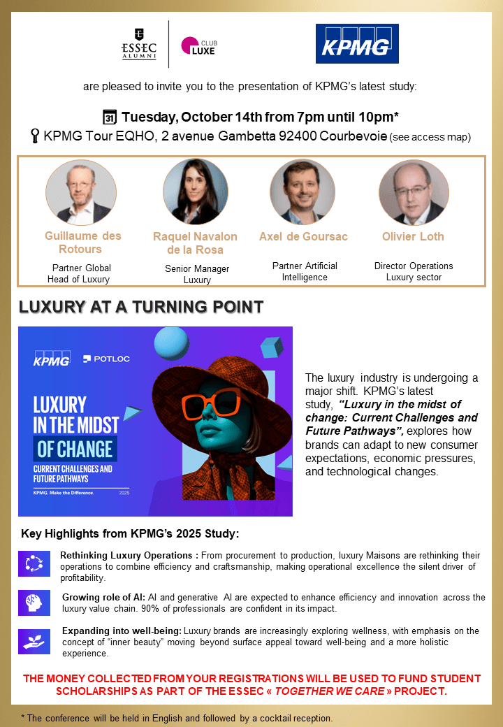 The ESSEC Alumni Luxury Club and KPMG are delighted to invite you to a presentation of KPMG’s latest study, taking place on October 14th from 7:00 PM to 10:00 PM.
