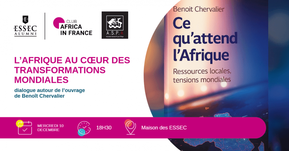 L'ESSEC Business School et sa Chaire Business et Industrie en Afrique ainsi que l'ESSEC Alumni Africa in France et les chapters Afrique de l'ESSEC ont le plaisir de vous inviter à une Conférence-Dédicace exceptionnelle autour de l’ouvrage « Ce qu’attend l’Afrique : ressources locales, tensions mondiales ».
