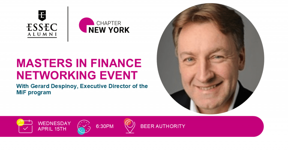 Join 60 students from the Masters in Finance program and the Executive Director of the program, Gerard Despinoy for a networking evening on Wednesday, April 15th in Manhattan.