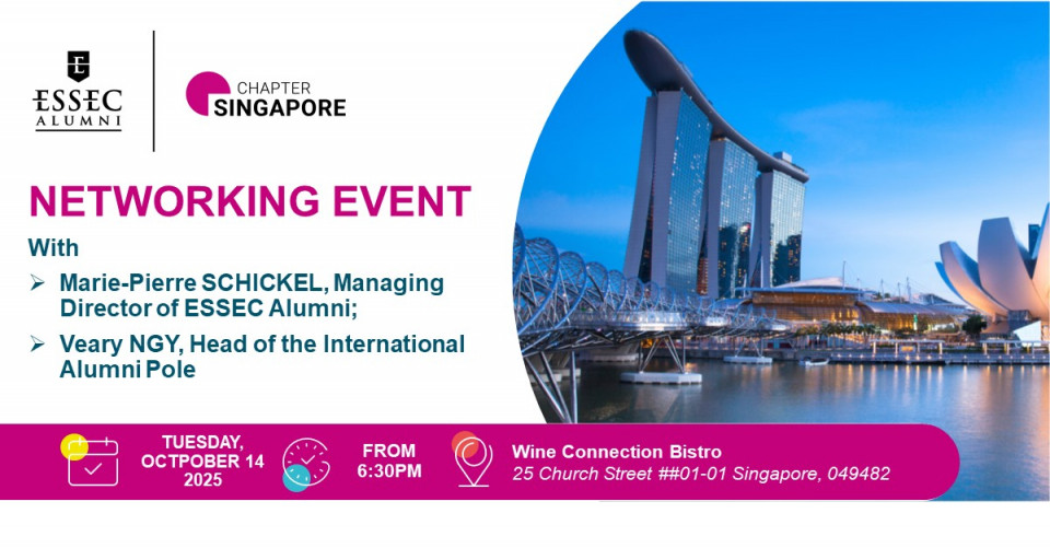 Come join us for our October networking event, which will be extra special this time as we welcome Marie-Pierre Schickel, Managing Director of ESSEC Alumni, and Veary Ngy, Head of the International Alumni Pole — both travelling from France to Singapore! 😀
