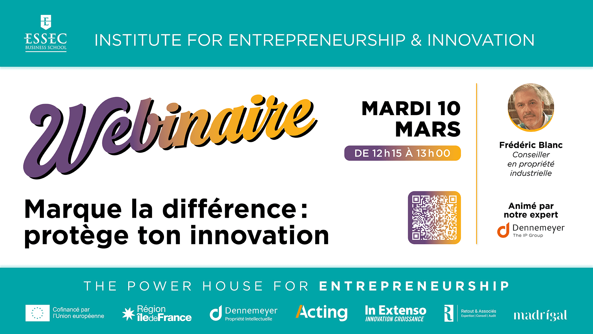 Marque, droits d’auteur, innovations, savoir-faire… La propriété intellectuelle est un véritable levier stratégique pour créer de la valeur, sécuriser son projet et accompagner sa croissance. Ce webinaire, organisé par l’ESSEC Institute for Entrepreneurship & Innovation et animé par leur partenaire Dennemeyer & Associés, vous donnera les clés essentielles pour comprendre, déposer et protéger votre innovation, quel que soit le stade de maturité de votre projet.