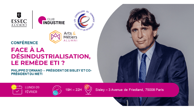 Le Club ESSEC Alumni Industrie, le Comité Paris des Conseillers du Commerce Extérieur de la France, et Arts et Metiers Alumni vous invitent à un échange avec Philippe d'Ornano, Président de Sisley et Co-Président du METI, le lundi 09 février à 19h au siège de Sisley, 3 Avenue de Friedland (Paris 8ᵉ).