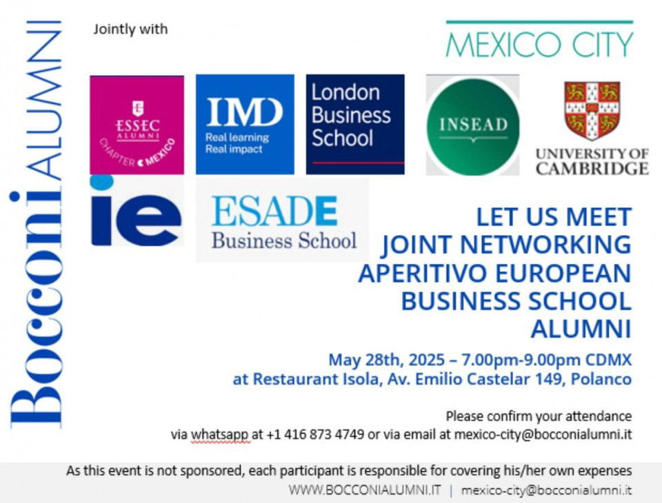 We are delighted to invite you to a European Business School alumni event taking place on Wednesday, May 28, 2025, from 7:00 PM to 9:00 PM at the Restaurant Isola in Mexico City.