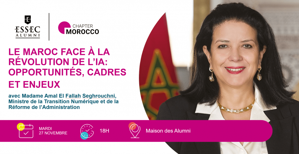 Le Chapter ESSEC Alumni Maroc et la Maison des Alumni ont le plaisir de vous inviter à une conférence exceptionnelle en présence de Madame Amal El Fallah Seghrouchni, Ministre de la Transition Numérique et de la Réforme de l’Administration du Royaume du Maroc.